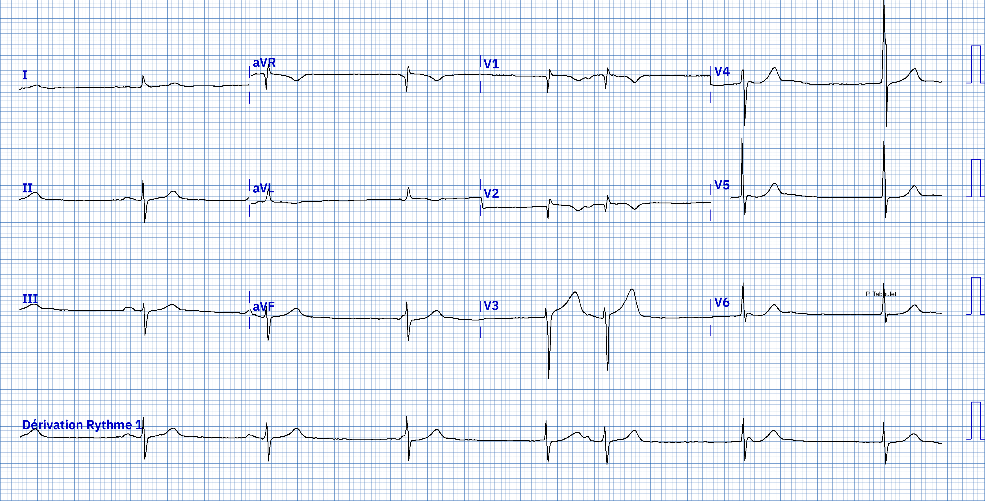 Commentaire : Dysfonction sinusale sévère avec rythme d'échappement jonctionnel occasionnel. Notez l'aspect en V1V2 (pseudo onde q de nécrose) lié à la position haute des électrodes V1V2 (erreur fréquente)