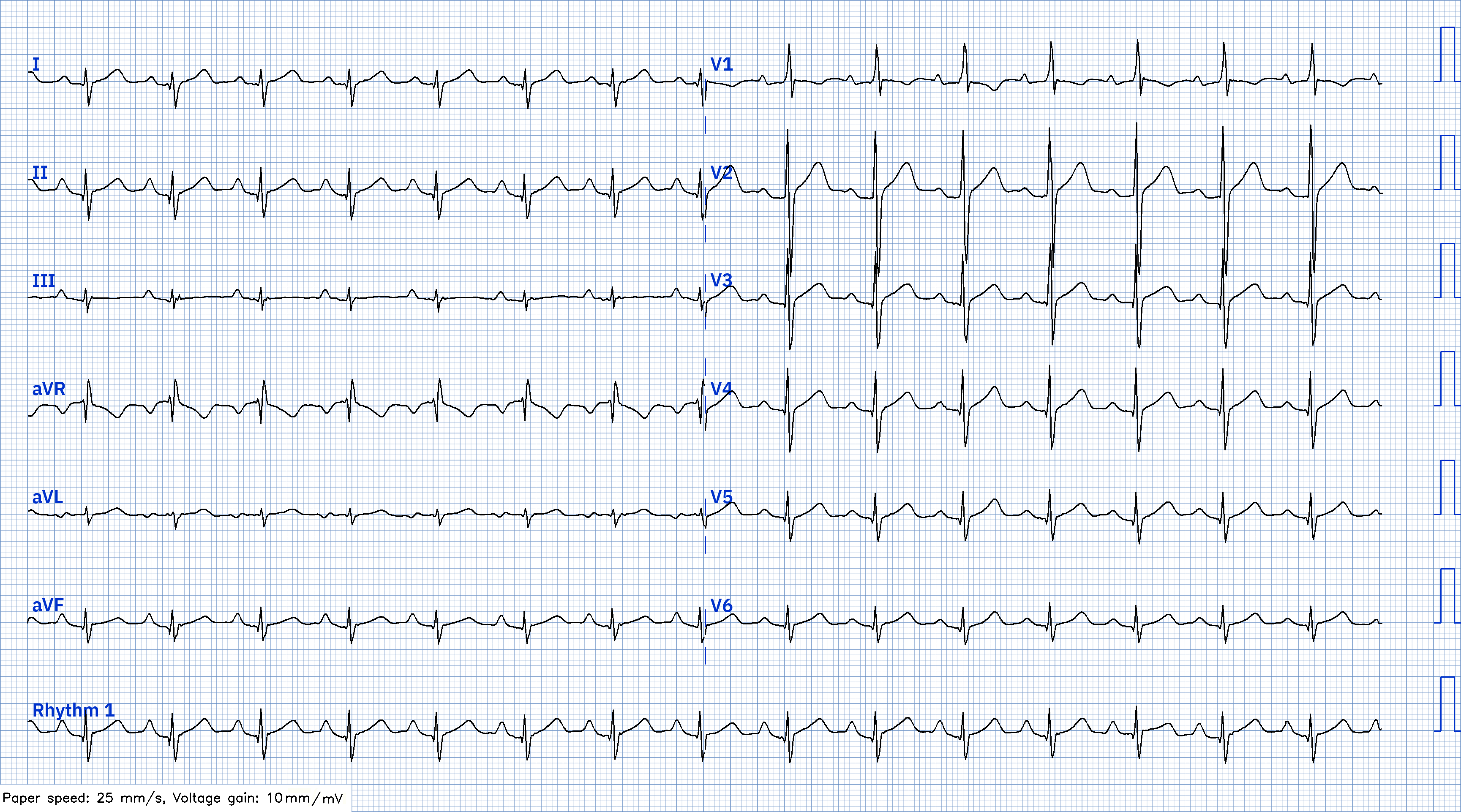 Commentaire : Aspect typique de cardiopathie pulmonaire chronique avec axe du coeur droit (voir D1), en V1 R > S en faveur d'une HVD. L'indice de Sokolow VD est positif (RV1 + SV5 > 10,5)