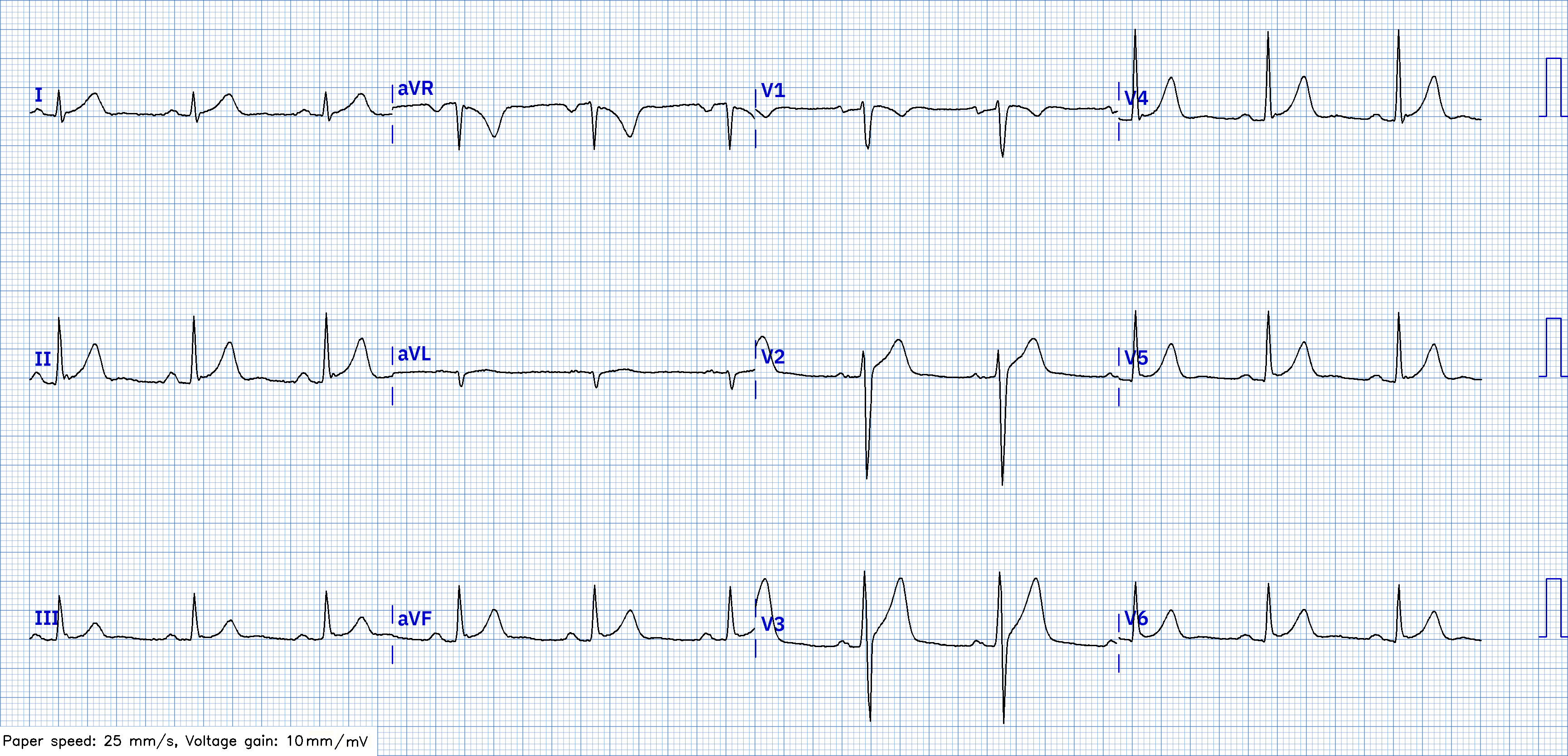 Commentaire : Discrète repolarisation précoce (onde J) expliquant le discret sus-décalage concave en haut en V5-V6-DIII-VF. Le reste de l'ECG est normal