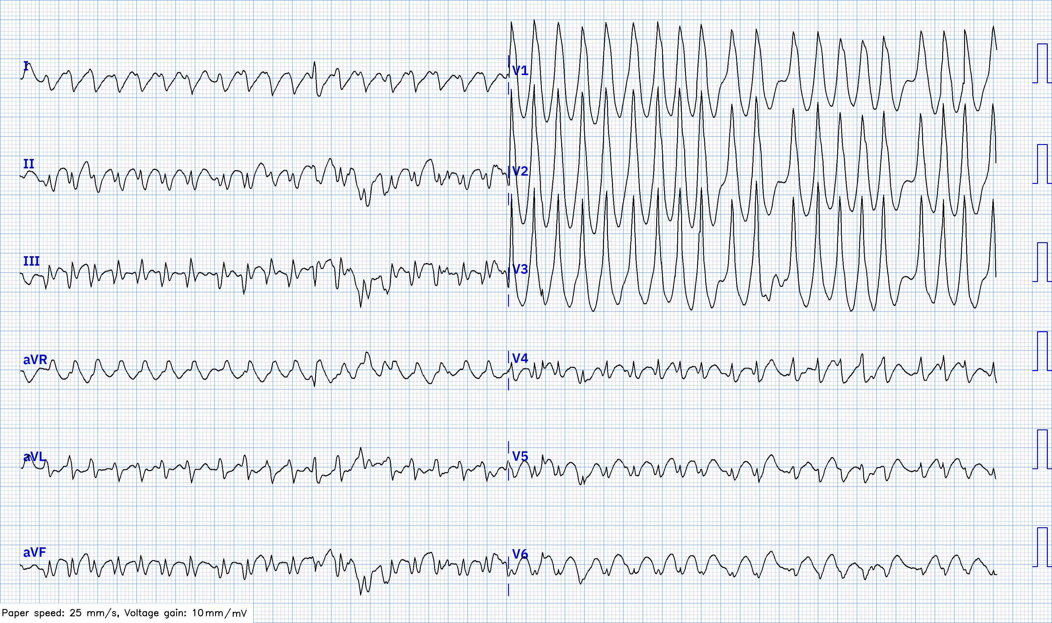 Commentaire : L'intervalle entre 2 complexes QRS est parfois proche d'un grand carreau soit 200 ms et une FC à 300/min. Une telle FC n'est pas possible via une conduction dans le noeud atrioventriculaire dont le but est de limiter la fréquence. La fibrillation atriale est ici conduite via une voie accessoire.