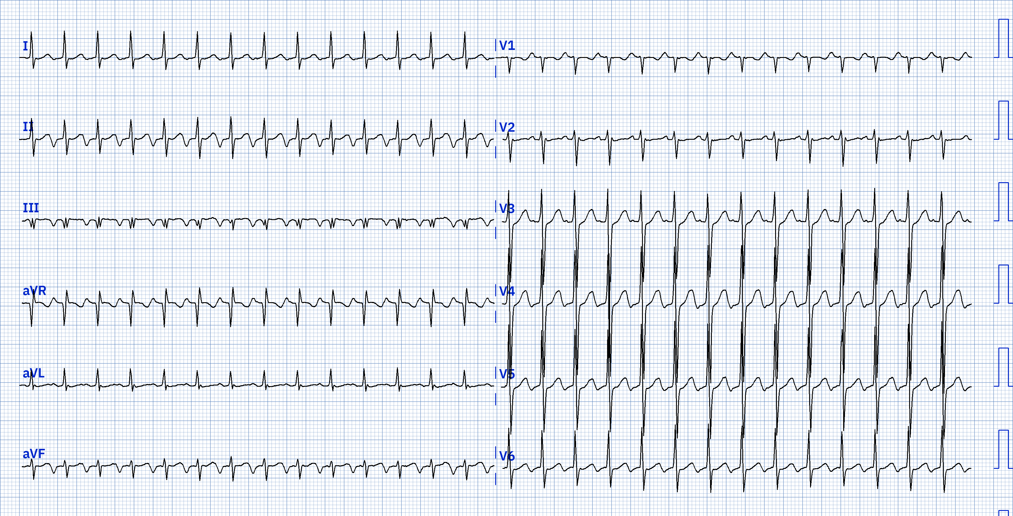 Commentaire : Tachycardie régulière à QRS fins avec une onde P atriale 1:1 de polarité négative en DII. Il peut s'agir d'une tachycardie atriale focale ou d'une TRIN fast-slow (c'est le cas ici). Les deux TSV sont rares