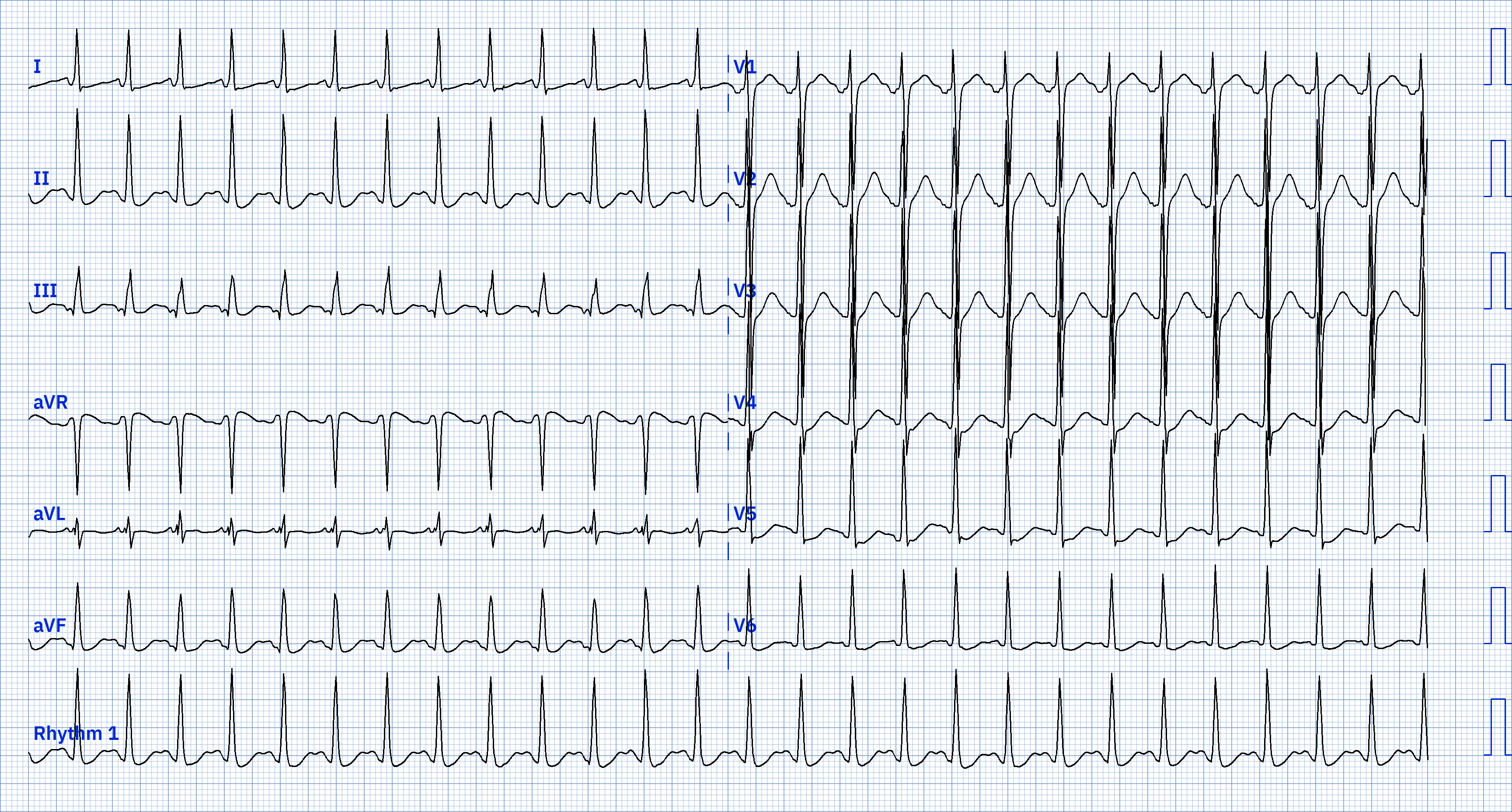 Commentaire : Tachycardie sinusale (P positives en DI-DII et conduites aux ventricules). FC 162 vraiment inhabituelle. Le reste de l'ECG est normal : conduction AV et IV, complexes QRS, repolarisation secondaire, QT difficile à apprécier